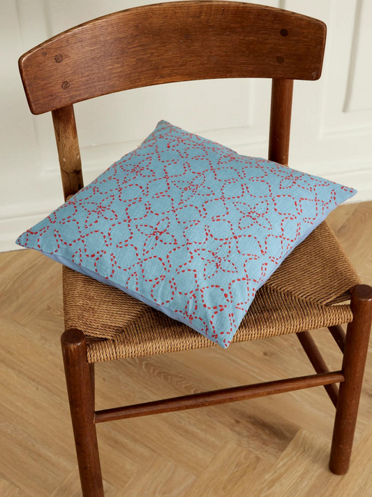 UdsolgtJou broderet pude i blå/rød
