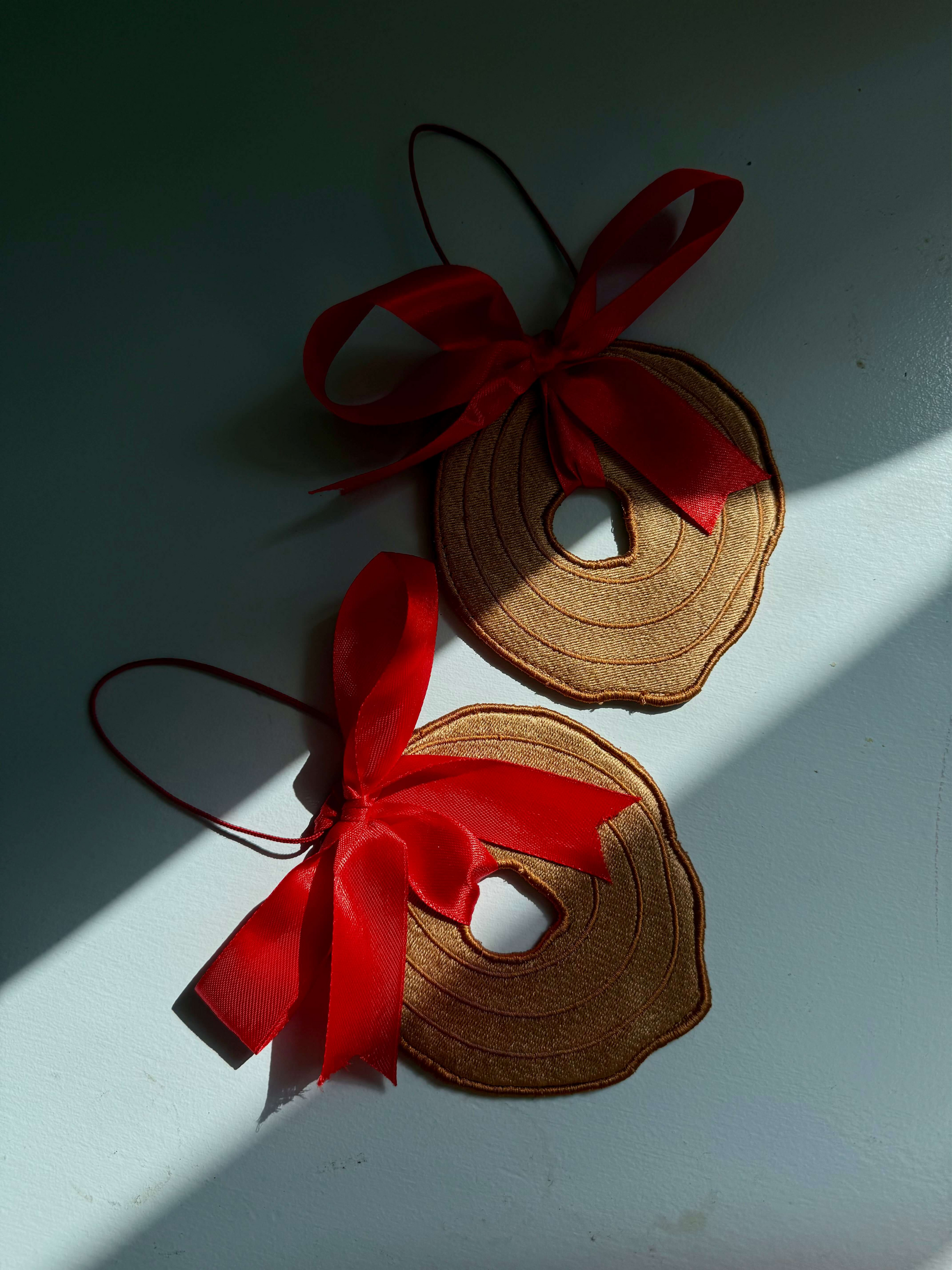 Giv dit juletræ eller din juledekoration et charmerende, traditionelt touch med denne dobbeltsidede vaniljekrans i blødt broderi. Den fine, røde sløjfe topper kransen og skaber en varm og indbydende julestemning. Perfekt som ophæng på juletræet, i vinduet eller som en del af en smuk juleguirlande. En elegant og nostalgisk detalje, der bringer hygge og julens dufte til hjemmet.